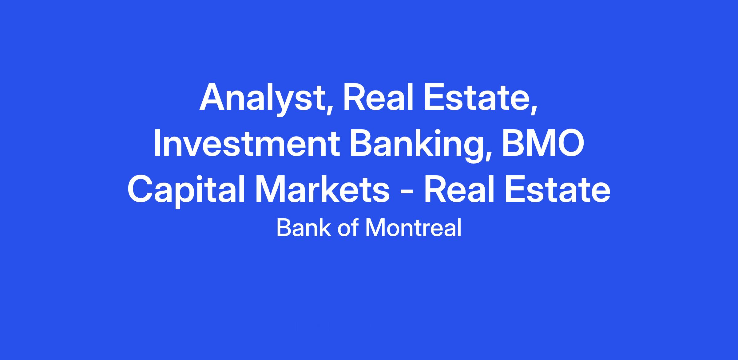 BMO Capital Markets is seeking an Investment Banking Analyst with an interest in real estate who will support the Real Estate Investment Banking team in Toronto.