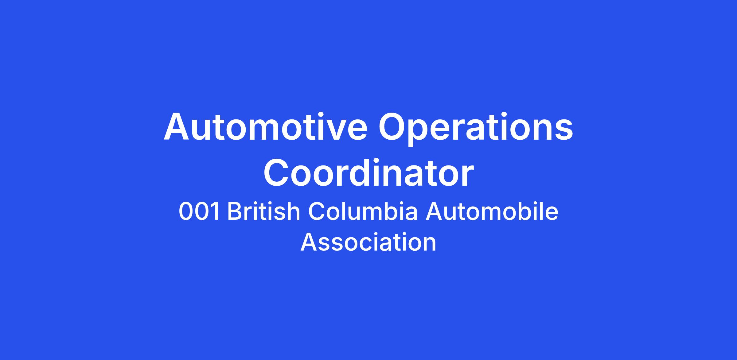 We are currently hiring an Automotive Operations Coordinator based in our Burnaby Fleet Depot, reporting to the Director, Road Assist Fleet and Partners.